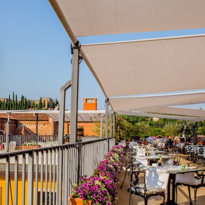 Il Due Torri Hotel, antichissimo 5 stelle veronese, parte di The Leading Hotel of the Word, apre le porte – e un po’ anche il cuore – al Gourmet Grill Restaurant. 300 metri quadri, sospesi a circa 30 metri da terra, a due passi da Sant’Anastasia. Nuove prospettive si spiegano allo sguardo che spazia dalla Torre dei Lamberti al Duomo, da Castel San Pietro alle Torricelle, con le dolci curve e le acque del Fiume Adige a fare da quinta scenografica e colonna sonora.