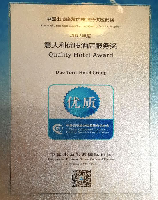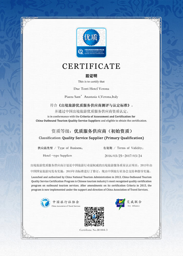 Due Torri Hotel, Verona Italy, is in conformance with the Criteria of Assessment and Certification for China Outbound Tourism Quality Service Suppliers and eligible to obtain the certification.